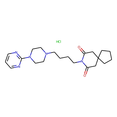 | CCSBASE_CCB5E371D4 | BUSPIRONE HYDROCHLORIDE | [M+H]+ | 386.2551 | 197.7 | C1CCC2(C1)CC(=O)N(C(=O)C2)CCCCN3CCN(CC3)C4=NC=CC=N4.Cl | small molecule | 1 | 7 | TW | calibrated with polyalanine and drug standards | |