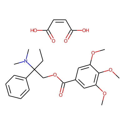 | CCSBASE_393E3E6C7E | TRIMEBUTINE MALEATE | [M+H]+ | 388.2119 | 198.7 | CCC(COC(=O)C1=CC(=C(C(=C1)OC)OC)OC)(C2=CC=CC=C2)N(C)C.C(=C\C(=O)O)\C(=O)O | small molecule | 1 | 7 | TW | calibrated with polyalanine and drug standards |