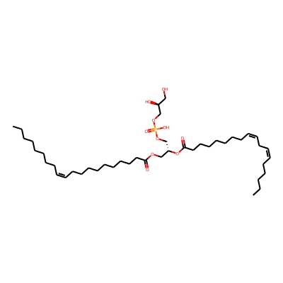 | CCSBASE_2B5F54A621 | PG(38:3) | [M-H]- | 799.5489 | 279.2 | [H][C@](O)(CO)COP(OC[C@]([H])(OC(CCCCCCC/C=C\C/C=C\CCCCC)=O)COC(CCCCCCCCC/C=C\CCCCCCCC)=O)(=O)O | lipid | 1 | 9 | DT | single field, calibrated with Agilent tune mix (Agilent) | |