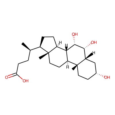 | CCSBASE_96CA55CF32 | Ursocholic acid | [M-H]- | 407.2797 | 205.1 | C[C@H](CCC(=O)O)[C@H]1CC[C@@H]2[C@@]1([C@H](C[C@H]3[C@H]2[C@H](C[C@H]4[C@@]3(CC[C@H](C4)O)C)O)O)C | small molecule | 1 | 10 | DT | stepped-field | |