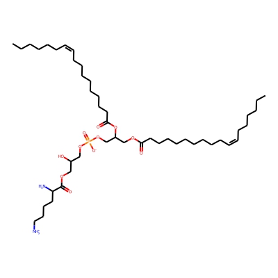 | CCSBASE_39632D260E | LysPG(35:1) | [M+H]+ | 891.647 | 303.5 | CCCCCCCCCCCCCCCCC(=O)OC(COC(=O)CCCCCCCCC\C=C/CCCCCC)CO[P]([O-])(=O)OCC(O)COC(=O)C(N)CCCC[NH3+] | lipid | 1 | 11 | TW | calibrated with phosphatidylcholines (ESI+) and phosphatidylethanolamines (ESI-) | |