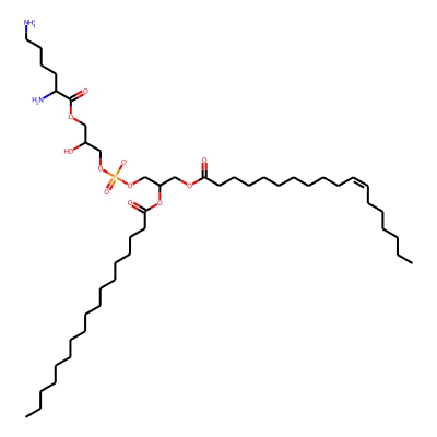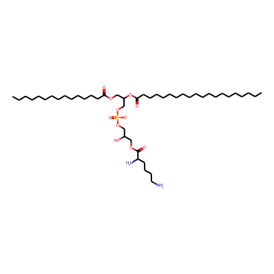 | CCSBASE_F533148628 | LysPG(36:0) | [M+H]+ | 907.677 | 308.7 | CCCCCCCCCCCCCCCCCCCCC(=O)OC(COC(=O)CCCCCCCCCCCCCC)CO[P]([O-])(=O)OCC(O)COC(=O)C(N)CCCC[NH3+] | lipid | 1 | 11 | TW | calibrated with phosphatidylcholines (ESI+) and phosphatidylethanolamines (ESI-) | |