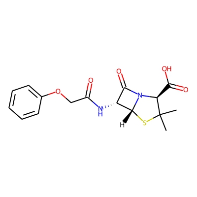 | CCSBASE_389697AC5C | PENICILLIN V | [M+H]+ | 351.1009 | 182.6 | CC1([C@@H](N2[C@H](S1)[C@@H](C2=O)NC(=O)COC3=CC=CC=C3)C(=O)O)C | small molecule | 1 | 15 | TW | calibrated with Waters Major Mix | |