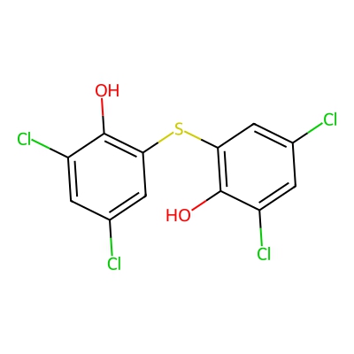 | CCSBASE_b80bfaeded7c1ff33136b416a6a8bf4f | Bithionol | [M-H]- | 354.874 | 0.97 | 170.35 | C1=C(C=C(C(=C1SC2=C(C(=CC(=C2)Cl)Cl)O)O)Cl)Cl | Organosulfur compounds | -1 | 1 | TW | polyala | ||