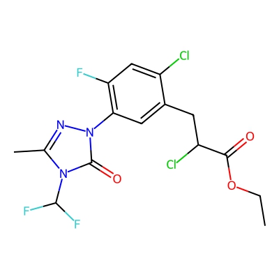 | CCSBASE_afd912cd7cc4c109d94b4006413b454b | Carfentrazone-ethyl | [M+H-H2O]+ | 394.0332 | 0.95 | 179.6 | CCOC(=O)C(CC1=CC(=C(C=C1Cl)F)N2C(=O)N(C(=N2)C)C(F)F)Cl | Organoheterocyclic compounds | 1 | 1 | TW | polyala |