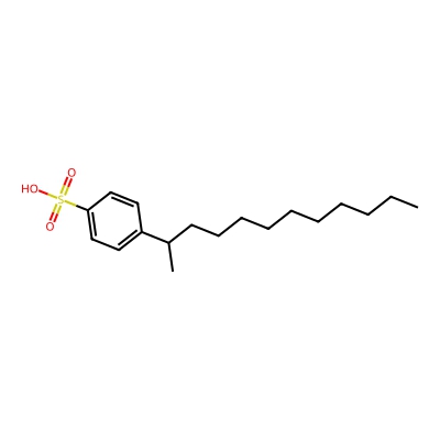 | CCSBASE_d0cc3a3d0eda4f2fbbed178205020fb5 | Sodium dodecylbenzenesulfonate | [M-H]- | 325.1843 | 1.04 | 188.88 | CCCCCCCCCCC(C)C1=CC=C(C=C1)S(=O)(=O)O | Benzenoids | -1 | 1 | TW | polyala | ||