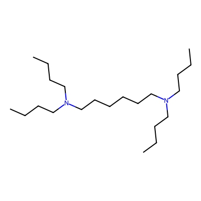 | CCSBASE_1a1cd41d8ae661f52a43c999170208e5 | N,N,N',N'-Tetrabutyl-1,6-hexanediamine | [M+H]+ | 341.389 | 0.73 | 194.01 | CCCCN(CCCC)CCCCCCN(CCCC)CCCC | Organic nitrogen compounds | 1 | 1 | TW | polyala |