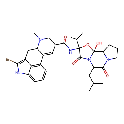 | CCSBASE_c6bdf2b00c24f843ca4719957f800c1c | Bromocriptine mesylate | [M+H-H2O]+ | 636.2181 | 0.79 | 227.2 | CC(C)CC1C(=O)N2CCCC2C3(N1C(=O)C(O3)(C(C)C)NC(=O)C4CN(C5CC6=C(NC7=CC=CC(=C67)C5=C4)Br)C)O | Alkaloids and derivatives | 1 | 1 | TW | polyala |
