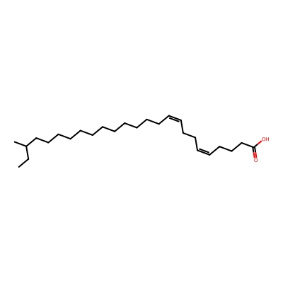 | CCSBASE_6FE3EE9FCE | FA(26:2) | [M-H]- | 391.35 | 196.72 | CCC(C)CCCCCCCCCCCC/C=C\CC/C=C\CCCC(=O)O | Lipids and lipid-like molecules | -1 | 20 | TIMS | single field, calibrated | |