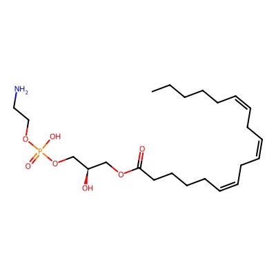 | CCSBASE_67C1759A95 | LPE(18:3) | [M-H]- | 474.256 | 204.76 | CCCCC/C=C\C/C=C\C/C=C\CCCCC(=O)OC[C@H](COP(=O)(O)OCCN)O | Lipids and lipid-like molecules | -1 | 20 | TIMS | single field, calibrated | |