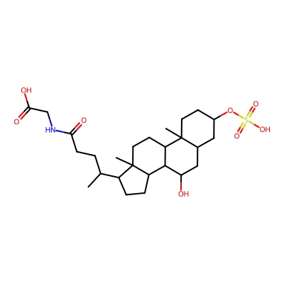 | CCSBASE_CEF7BD5B79 | Glycochenodeoxycholic acid 3-sulfate | [M-SO3-H2O+HCOO]- | 476.30027 | 204.7 | C[C@H](CCC(=O)NCC(=O)O)[C@H]1CC[C@@H]2[C@@]1(CC[C@H]3[C@H]2[C@@H](C[C@H]4[C@@]3(CC[C@H](C4)OS(=O)(=O)O)C)O)C | Lipids and lipid-like molecules | -1 | 21 | DT | single field, calibrated | |