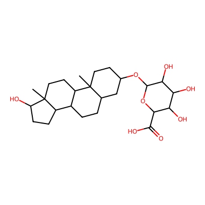 | CCSBASE_6250850849 | 5-alpha-androstan-3alpha,17beta-diol glucuronide | [M-H]- | 467.2650382 | 224.84 | CC12CCC3C(CCC4CC(OC5OC(C(=O)O)C(O)C(O)C5O)CCC43C)C1CCC2O | None | -1 | 23 | TW | calibrated with small molecules, "System Suitability Test" mix | |