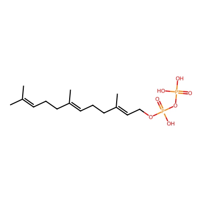| CCSBASE_C5CB1B9BAE | Farnesyl pyrophosphate | [M-H]- | 381.1232 | 183.8520866 | CC(=CCC/C(=C/CC/C(=C/COP(=O)(O)OP(=O)(O)O)/C)/C)C | Lipids and lipid-like molecules | -1 | 4 | DT | single field, calibrated with Agilent tune mix (Agilent) | |