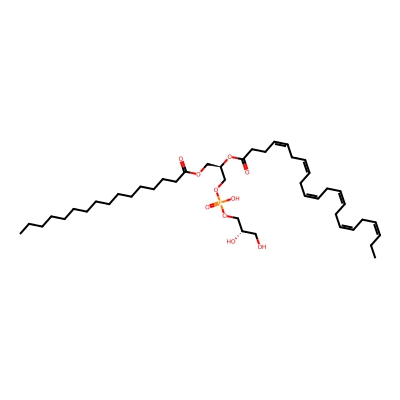 | CCSBASE_1EBEE26074 | PG(40:6) | [M+Na]+ | 845.534 | 290.0 | CCCCC/C=C\C/C=C\CCCCCCCCCCCC(=O)OC[C@H](COP(=O)(O)OC[C@H](CO)O)OC(=O)CCCC/C=C\C/C=C\C/C=C\C/C=C\CC | Lipids and lipid-like molecules | 1 | 5 | TW | calibrated with phosphatidylcholines (ESI+) and phosphatidylethanolamines (ESI-) | |