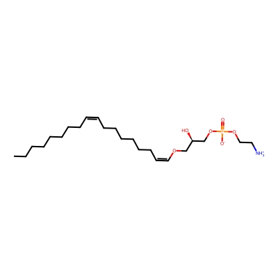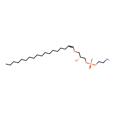 | CCSBASE_FA02F34608 | LPE(p16:0) | [M+H]+ | 438.297 | 215.6 | CCCCCCCCCCCCCC/C=C\OC[C@H](COP(=O)([O-])OCC[NH3+])O | Lipids and lipid-like molecules | 1 | 5 | TW | calibrated with phosphatidylcholines (ESI+) and phosphatidylethanolamines (ESI-) | |