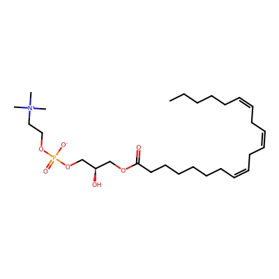 | CCSBASE_FE011A058B | LPC(20:3) | [M+H]+ | 546.356 | 239.0 | CCCCC/C=C\C/C=C\C/C=C\CCCCCCC(=O)OC[C@H](COP(=O)([O-])OCC[N+](C)(C)C)O | Lipids and lipid-like molecules | 1 | 5 | TW | calibrated with phosphatidylcholines (ESI+) and phosphatidylethanolamines (ESI-) | |