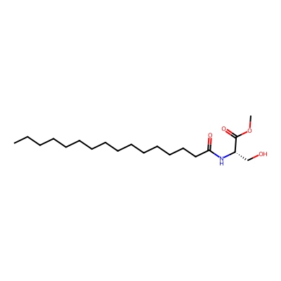 | CCSBASE_108923a4c08daf459506ddad70c60454 | N-16:0 L-Serine MeEster | [M+Na]+ | 380.2771138 | 199.866666667 | CCCCCCCCCCCCCCCC(=O)N[C@@H](CO)C(=O)OC | Organic acids and derivatives | 1 | 27 | TIMS | calibrated with ESI Low Concentration Tuning Mix (Agilent) | |