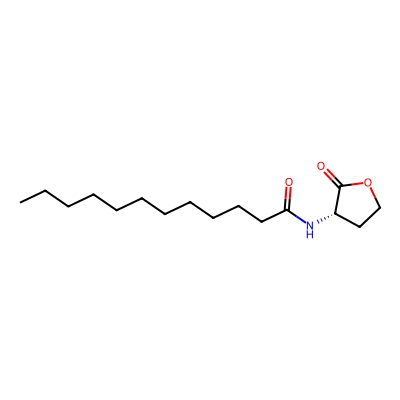 | CCSBASE_436b48468cb73e60dd4ce8a0060edb1f | N-dodecanoyl-L-homoserine lactone | [M+Na]+ | 306.2039528 | 182.9 | CCCCCCCCCCCC(=O)N[C@H]1CCOC1=O | Organic acids and derivatives | 1 | 27 | TIMS | calibrated with ESI Low Concentration Tuning Mix (Agilent) | |