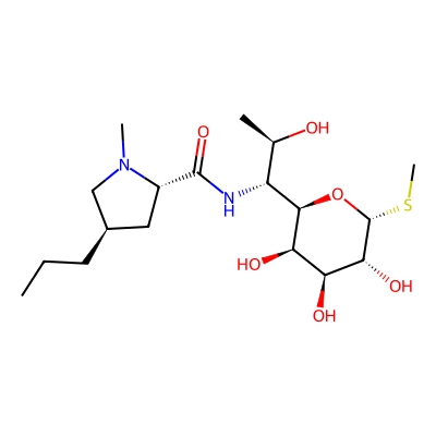 | CCSBASE_2E6480B184 | Lincomycin | [M+H]+ | 407.221 | 201.8 | CCC[C@@H]1C[C@H](N(C1)C)C(=O)N[C@@H]([C@@H]2[C@@H]([C@@H]([C@H]([C@H](O2)SC)O)O)O)[C@@H](C)O | Organic acids and derivatives | 1 | 6 | TW | ? | |