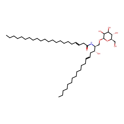 | CCSBASE_1BA717A4D5 | GlcCer(40:2) | [M+Na]+ | 804.63 | 297.1 | CCCCCCCCCCCCCCCCCCC=CCC(=O)N[C@@H](CO[C@H]1C(C([C@@H]([C@H](O1)CO)O)O)O)[C@@H](CC=CCCCCCCCCCCCC)O | Lipids and lipid-like molecules | 1 | 1 | DT | stepped-field | |
