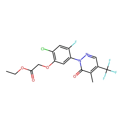 | CCSBASE_8e199f6282bad5d4958ded26df43972e | Flufenpyr-ethyl | [M+H]+ | 409.0573 | 181.86 | CCOC(=O)COC1=C(C=C(C(=C1)N2C(=O)C(=C(C=N2)C(F)(F)F)C)F)Cl | Benzenoids | 1 | 29 | TW | polyala | |