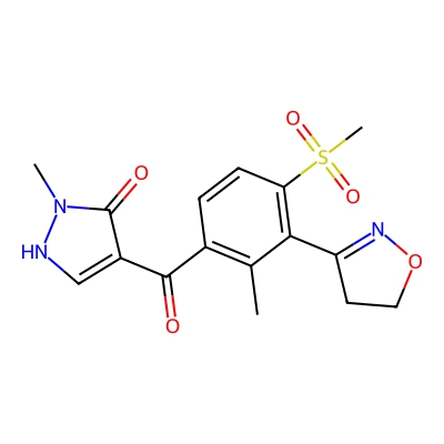 | CCSBASE_68fdf226257fc41338f319309168e8a5 | Topramezone | [M+Na]+ | 386.0781 | 189.17 | CC1=C(C=CC(=C1C2=NOCC2)S(=O)(=O)C)C(=O)C3=CNN(C3=O)C | Benzenoids | 1 | 29 | TW | polyala | |