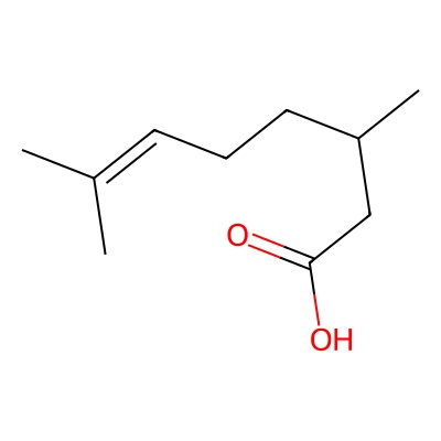 | CCSBASE_81c4dfc9935dc5a43ff1be8307345cce | Citronellic acid | [M-H]- | 169.1234 | 152.32 | CC(CCC=C(C)C)CC(=O)O | Lipids and lipid-like molecules | -1 | 29 | TW | polyala | |