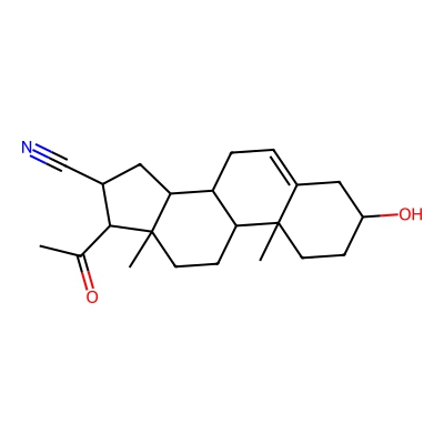 | CCSBASE_3533676b467851452e4815cea3fa35a0 | Pregnenolone carbonitrile | [M+H]+ | 342.2428 | 183.71 | CC(=O)C1C(CC2C1(CCC3C2CC=C4C3(CCC(C4)O)C)C)C#N | Lipids and lipid-like molecules | 1 | 29 | TW | polyala |