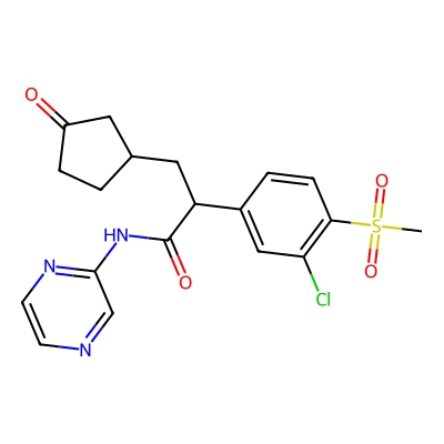 | CCSBASE_a5a438247e481101e245165d04b71bf6 | Piragliatin | [M-H]- | 420.079 | 203.59 | CS(=O)(=O)C1=C(C=C(C=C1)C(CC2CCC(=O)C2)C(=O)NC3=NC=CN=C3)Cl | Benzenoids | -1 | 29 | TW | polyala | |