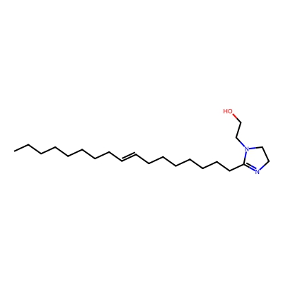 | CCSBASE_d40776d25d0417302ee00492891685a9 | 2-(8-Heptadecenyl)-2-imidazoline-1-ethanol | [M+H-H2O]+ | 333.3265 | 199.74 | CCCCCCCCC=CCCCCCCCC1=NCCN1CCO | Organoheterocyclic compounds | 1 | 29 | TW | polyala | |