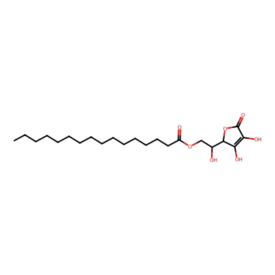 | CCSBASE_52b79907ca4a9688c8104f01611936a2 | Ascorbyl palmitate | [M-H]- | 413.2545 | 204.19 | CCCCCCCCCCCCCCCC(=O)OCC(C1C(=C(C(=O)O1)O)O)O | Lipids and lipid-like molecules | -1 | 29 | TW | polyala | |