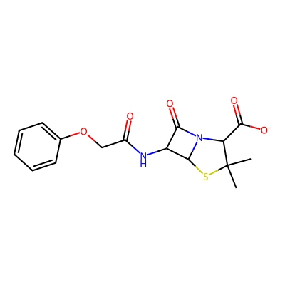 | CCSBASE_72f25ee9cd11553d7a05e95c130bf608 | Penicillin VK | [M+H]+ | 351.1009 | 180.31 | CC1(C(N2C(S1)C(C2=O)NC(=O)COC3=CC=CC=C3)C(=O)[O-])C | Organic acids and derivatives | 1 | 29 | TW | polyala | |