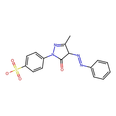 | CCSBASE_3b91b9d8399bff5be89f812b7c7a4017 | Acid Yellow 11 | [M-H]- | 357.0663 | 196.16 | CC1=NN(C(=O)C1N=NC2=CC=CC=C2)C3=CC=C(C=C3)S(=O)(=O)[O-] | Organic acids and derivatives | -1 | 29 | TW | polyala | |
