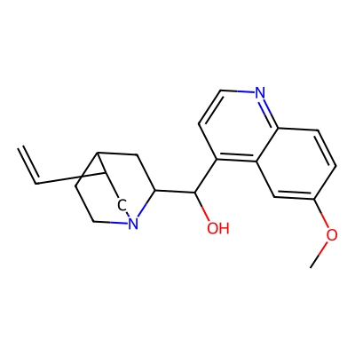 | CCSBASE_91240be835077b520b99e559a4512713 | Quinine hydrochloride dihydrate | [M+H]+ | 325.1911 | 175.81 | COC1=CC2=C(C=CN=C2C=C1)C(C3CC4CCN3CC4C=C)O | Alkaloids and derivatives | 1 | 29 | TW | polyala | |