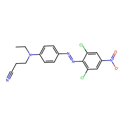 | CCSBASE_23583818a57ffff6aea5ba756c17e664 | C.I. Disperse Orange 37 | [M+H]+ | 392.0676 | 192.29 | CCN(CCC#N)C1=CC=C(C=C1)N=NC2=C(C=C(C=C2Cl)[N+](=O)[O-])Cl | Organoheterocyclic compounds | 1 | 29 | TW | polyala | |