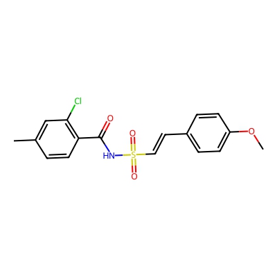 | CCSBASE_db6f3903ee3aae2745667ca9fee25e52 | PharmaGSID_48514 | [M]- | 365.0415 | 190.71 | CC1=CC(=C(C=C1)C(=O)NS(=O)(=O)C=CC2=CC=C(C=C2)OC)Cl | Benzenoids | -1 | 29 | TW | polyala | |