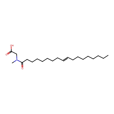 | CCSBASE_9f1f1fb2dcd554817df48c36a45577b3 | Oleyl sarcosine | [M-H]- | 352.2857 | 196.52 | CCCCCCCCC=CCCCCCCCC(=O)N(C)CC(=O)O | Organic acids and derivatives | -1 | 29 | TW | polyala | |