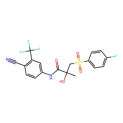 | CCSBASE_1374032ee614595d2cc5e0b8ec8f9a83 | Bicalutamide | [M-H]- | 429.0537 | 186.3 | CC(CS(=O)(=O)C1=CC=C(C=C1)F)(C(=O)NC2=CC(=C(C=C2)C#N)C(F)(F)F)O | Benzenoids | -1 | 29 | TW | polyala | |