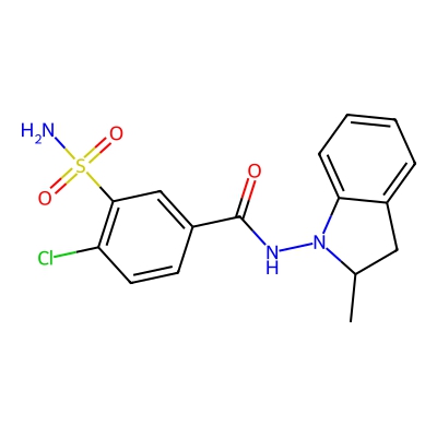 | CCSBASE_814bcd287b6e90d081e0dbe9a144885a | Indapamide | [M-H]- | 364.0528 | 186.67 | CC1CC2=CC=CC=C2N1NC(=O)C3=CC(=C(C=C3)Cl)S(=O)(=O)N | Benzenoids | -1 | 29 | TW | polyala | |