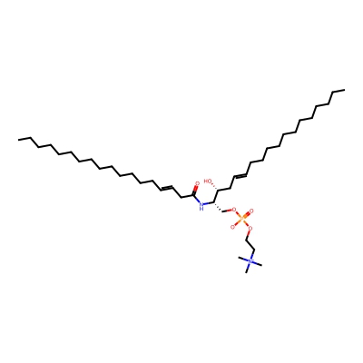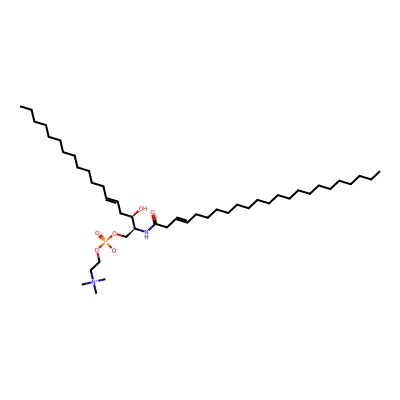 | CCSBASE_CB6690226E | SM(41:1) | [M+Na]+ | 823.67 | 306.3 | CCCCCCCCCCCCCCCCCCCCCCC(=O)N[C@@H](COP(=O)([O-])OCC[N+](C)(C)C)[C@@H](CC=CCCCCCCCCCCCC)O | Lipids and lipid-like molecules | 1 | 1 | DT | stepped-field | |