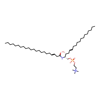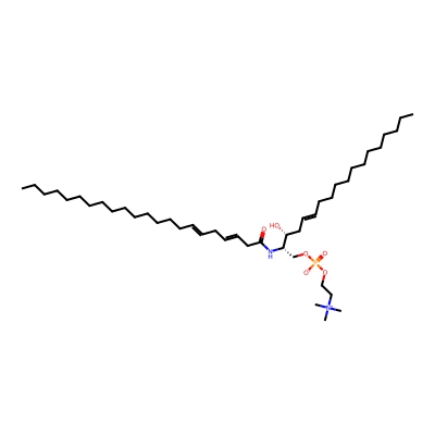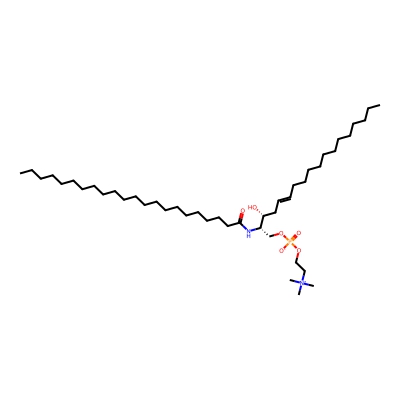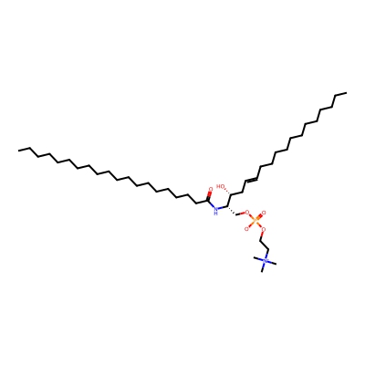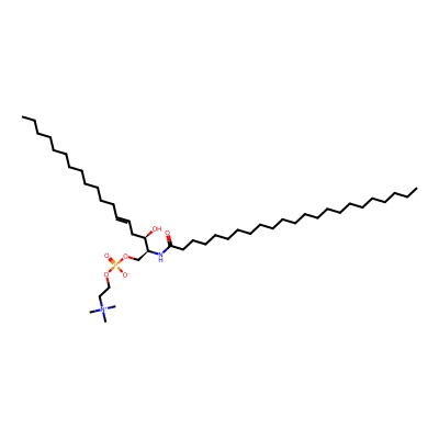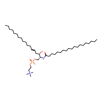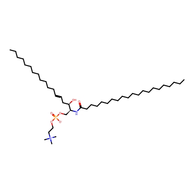 | CCSBASE_C1A675D6A7 | SM(40:0) | [M+Na]+ | 811.67 | 305.7 | CCCCCCCCCCCCCCCCCCCCCC(=O)N[C@@H](COP(=O)([O-])OCC[N+](C)(C)C)[C@@H](CCCCCCCCCCCCCCC)O | Lipids and lipid-like molecules | 1 | 1 | DT | stepped-field | |