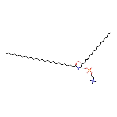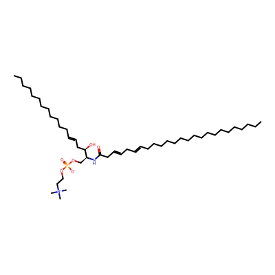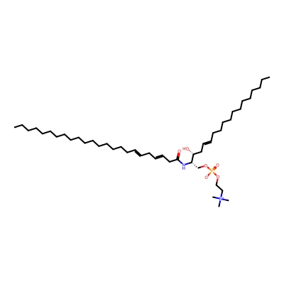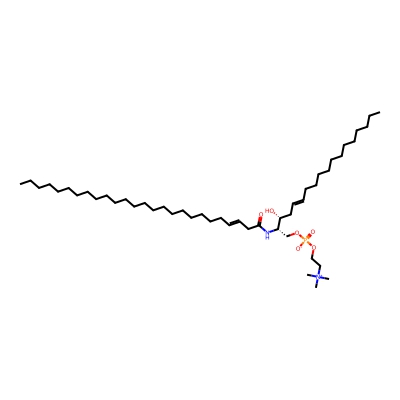 | CCSBASE_2DCBF6568A | SM(44:1) | [M+Na]+ | 865.71 | 315.1 | CCCCCCCCCCCCCCCCCCCCCCCCCC(=O)N[C@@H](COP(=O)([O-])OCC[N+](C)(C)C)[C@@H](CC=CCCCCCCCCCCCC)O | Lipids and lipid-like molecules | 1 | 1 | DT | stepped-field | |