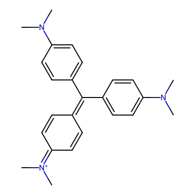 | CCSBASE_10A309DBF1 | GENTIAN VIOLET | [M]+ | 372.244 | 204.6 | CN(C)c1ccc(C(=C2C=CC(=[N+](C)C)C=C2)c2ccc(N(C)C)cc2)cc1 | None | 1 | 7 | TW | calibrated with polyalanine and drug standards | |