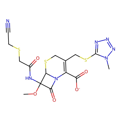| CCSBASE_9FE7550218 | CEFMETAZOLE SODIUM | [M+Na]+ | 494.0345 | 193.6 | COC1(NC(=O)CSCC#N)C(=O)N2C(C(=O)[O-])=C(CSc3nnnn3C)CSC21 | None | 1 | 7 | TW | calibrated with polyalanine and drug standards | |