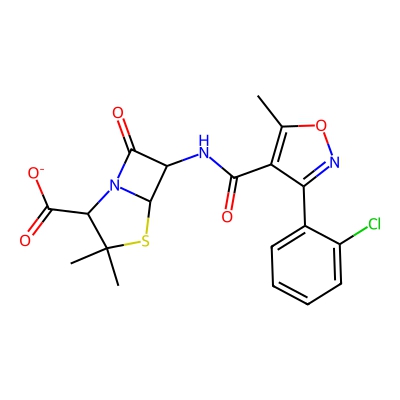 | CCSBASE_E77E11CE65 | CLOXACILLIN SODIUM | [M+Na]+ | 458.0548 | 198.2 | Cc1onc(-c2ccccc2Cl)c1C(=O)NC1C(=O)N2C1SC(C)(C)C2C(=O)[O-] | None | 1 | 7 | TW | calibrated with polyalanine and drug standards | |