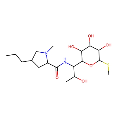 | CCSBASE_0B74676B78 | LINCOMYCIN HYDROCHLORIDE | [M+H]+ | 407.2211 | 199.1 | CCCC1CC(C(=O)NC(C(C)O)C2OC(SC)C(O)C(O)C2O)N(C)C1 | None | 1 | 7 | TW | calibrated with polyalanine and drug standards | |