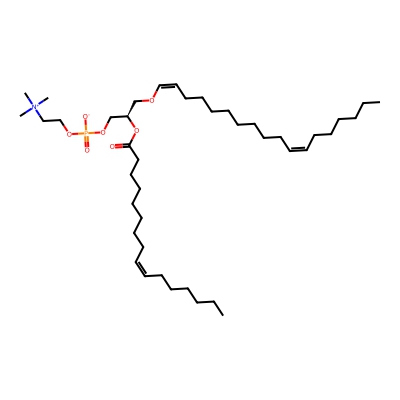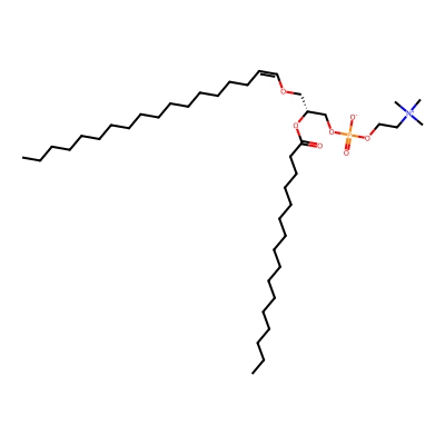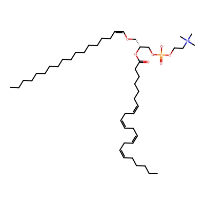 | CCSBASE_F72996C265 | PC(p40:4) | [M+H]+ | 822.6376 | 300.9 | CCCCCCCCCCCCCCCC/C=C\OC[C@H](COP(=O)([O-])OCC[N+](C)(C)C)OC(=O)CCCCC/C=C\C/C=C\C/C=C\C/C=C\CCCCC | Lipids and lipid-like molecules | 1 | 9 | DT | single field, calibrated with Agilent tune mix (Agilent) | |