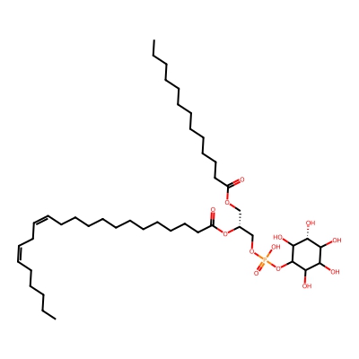| CCSBASE_245914CEF6 | PI(35:2) | [M+NH4]+ | 866.5759 | 295.6 | CCCCCCCCCCCCC(=O)OC[C@H](COP(=O)(O)OC1C([C@@H](C(C(C1O)O)O)O)O)OC(=O)CCCCCCCCCCC/C=C\C/C=C\CCCCC | Lipids and lipid-like molecules | 1 | 9 | DT | single field, calibrated with Agilent tune mix (Agilent) | |