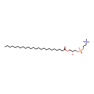 | CCSBASE_3EFBC93765 | LPC(24:0) | [M+Na]+ | 630.4474356 | 262.4333333 | CCCCCCCCCCCCCCCCCCCCCCCC(=O)OC[C@H](COP(=O)([O-])OCC[N+](C)(C)C)O | Lipids and lipid-like molecules | 1 | 10 | DT | stepped-field | |
