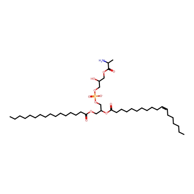 | CCSBASE_61D2A9E56F | AlaPG(34:1) | [M+H]+ | 820.581 | 291.7 | CCCCCCCCCCCCCCCC(=O)OCC(COP(=O)([O-])OCC(COC(=O)C(C)[NH3+])O)OC(=O)CCCCCCCCC/C=C\CCCCCC | None | 1 | 11 | TW | calibrated with phosphatidylcholines (ESI+) and phosphatidylethanolamines (ESI-) | |